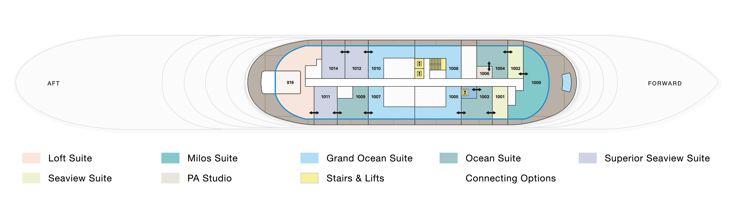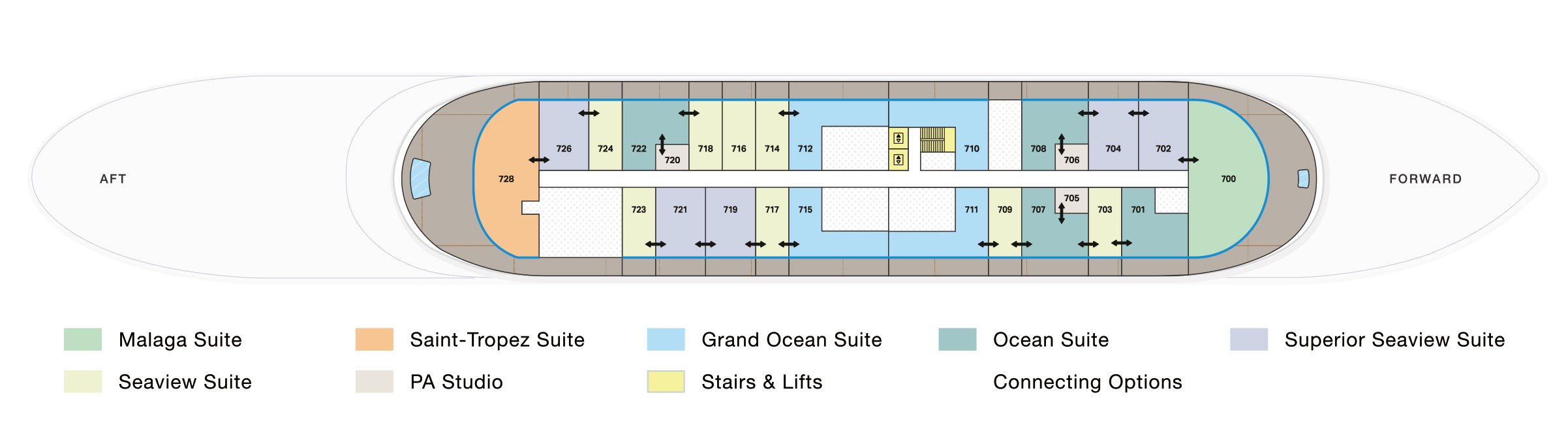 我們的海景套房非常適合兩人入住,是美麗的海上休憩之所。寧靜寬敞的臥室配有雙梳妝台大理石浴室,讓您恢復活力,並在私人露臺上欣賞無盡的美景。與朋友或家人一起旅行的客人可以利用幾乎無限的可能性,在整個甲板上組合海景套房,以及帶有相鄰個人員工工作室的套房,以增加便利性。