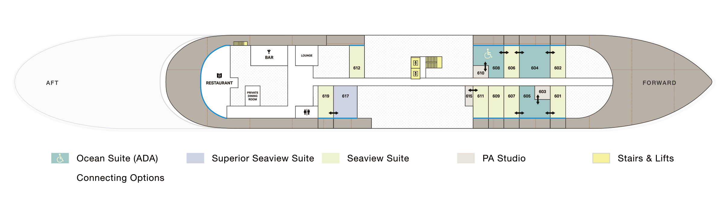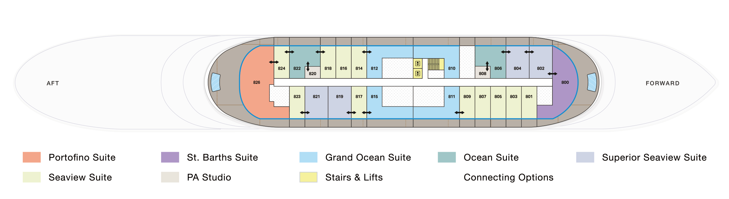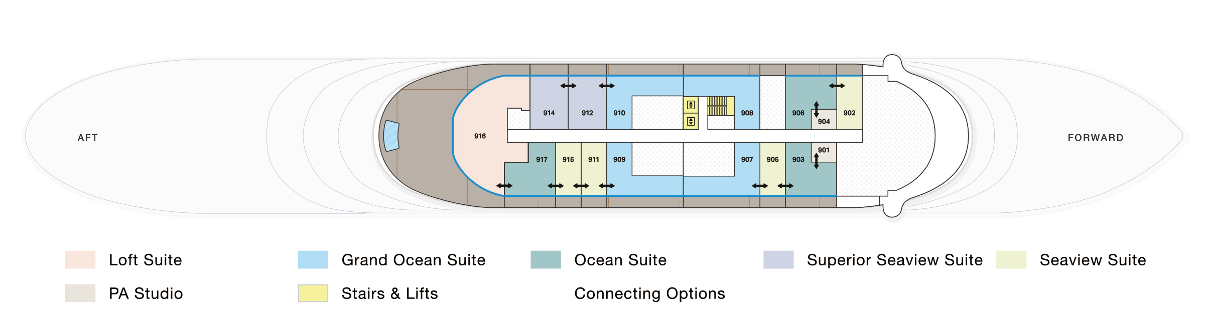 我們的高級海景套房可應要求提供一張加大雙人床或拼床。每間客房均設有附浸泡浴缸和步入式淋浴間的雙梳妝台浴室以及可欣賞迷人海景的寬敞私人露臺。與朋友或家人一起旅行的客人可以利用幾乎無限的可能性,在整個甲板上組合高級海景套房。